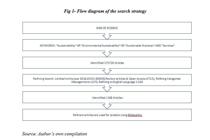 A carefully constructed keyword search was performed using terms such as “Sustainability,” “Environmental Sustainability,” “Sustainable Practices,” and “Services.” This approach was intentionally broad yet focused, allowing the capture of a wide range of relevant literature related to sustainability in service industries.