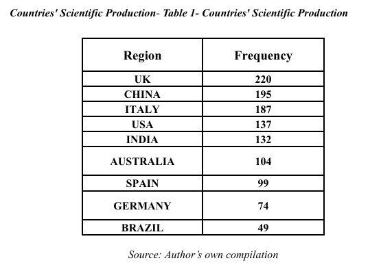 Table 1 offers a snapshot of the global landscape of sustainability research, showing how different countries contribute to the field. The United Kingdom leads with 220
