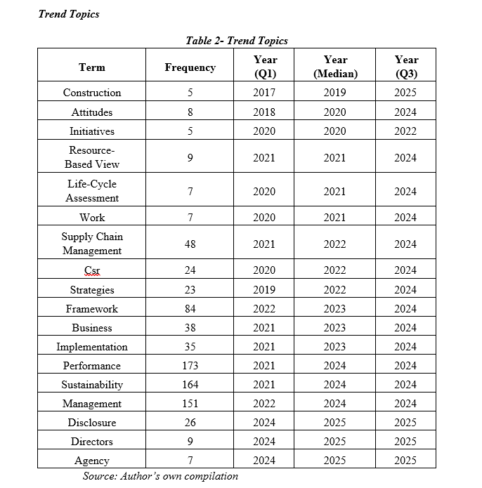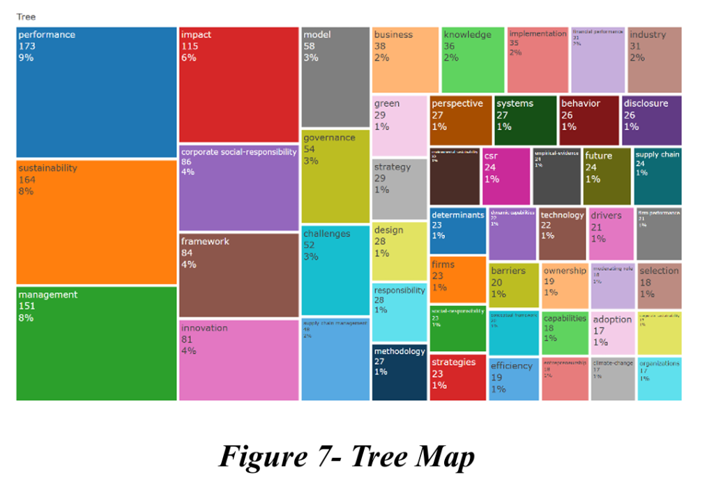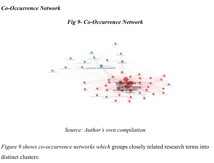 The most frequently occurring keywords as of figure 6 in the bibliometric analysis reflect core research themes and emerging areas of interest. Keywords such as “sustainability,” “performance,” “management,” and “corporate social responsibility” indicate major focus areas within the field. The presence of terms like “innovation,” “supply chain,” and “financial performance” suggests interdisciplinary connections between business sustainability, operational efficiency, and environmental responsibility.