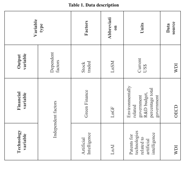 (WDI) (World Bank, 2024). Additionally, data regarding artificial intelligence and green finance (GF) were sourced from the OECD statistics database. The stock market (SM) is the dependent variable in the current study. In the current study, FDI, Tr, and stock traded were measured in terms of current US$ and inflation is calculated as consumer price (annual percentage), whereas the exchange rate is measured in terms of LCU per US$, period average. The OECD’s patent databases, which offer comprehensive information on patent filings categorised by technological disciplines, including AI-related advancements like machine learning, robotics, and data analytics, are the source of the AI variable, which is defined as patents for technologies related to artificial intelligence. For, green finance, we have taken data related to Environmentally related government R&D budget, percentage total government R&D. For all our data analysis and econometric modelling, we used EViews 12, an exhaustive econometric software. To ensure that the data was normally distributed, the factors were converted into logarithms. Table 1 provides a detailed overview of factors used in the study, together with information on sources, rationale, unit of measurement, and data description.