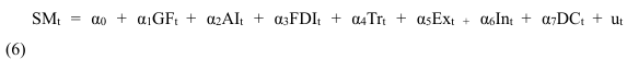 InSMt = α0 + α1LnSMt + α2LnGFt + α3LnAIt + α4LnFDIt + α5LnTrt + α6LnExt + α7LnInt