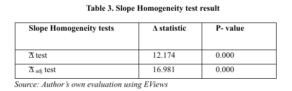 The results of the Pesaran and Yamagata (2008) slope homogeneity test are shown in Table 3. The delta statistics are highly significant. Hence, the null hypothesis of slope homogeneity is rejected. In other words, the slopes in the panel data model are not uniform among the cross-sectional units. This means the influence of the exogenous variable on the endogenous variable (stock traded as a dependent variable in the current study) varies, leading to a slope heterogeneity issue.