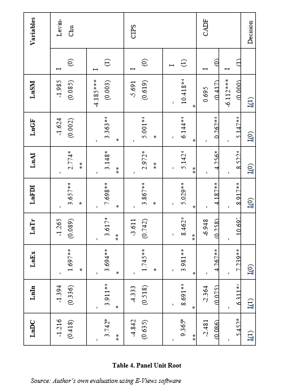 Unit root tests are often employed to test the stationarity of the factors used in the analysis. As described in the research of Joo et al. (2023), a data set is considered to be stationary if the average, variance, and covariance of the data are constant. In the current research, Im, Pesaran, and Shin (IPS), which has been introduced by Im et al. (2003), and LLC (Levin, Lin, and Chu) tests developed by Levin et al. (2002) are the first-generation unit root tests, and CIPS and CADF second-generation unit root tests, which take intoconsideration slope variation and cross-sectional dependency created by Pesaran (2007), were employed. Such similar tests were employed in the research undertaken by Raihanet al. (2024).