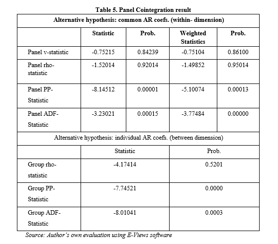 The findings of Pedroni’s cointegration test, which was used to determine whether there was a long-term connection between the variables, are displayed in Table 5. Two sets of substitute theories are assessed: Common autoregressive coefficients within the dimension (ii) and individual autoregressive coefficients between dimensions (iii). Despite being statistically insignificant, the panel v-statistic and rho-statistic are both negative, suggesting conflicting evidence for a long-term relationship. Nonetheless, the highly significant panel PP-statistic and panel ADF-statistic results show that the no cointegration hypothesis is strongly refuted. Furthermore, the significantly negative Group PP and Group ADF statistics clearly contradict the null hypothesis that there is no cointegration between panels. The group rho-statistic is positive but not significant if individual autoregressive coefficients between dimensions are assumed. Although there may be some variance in the autoregressive coefficients within and between dimensions, these results typically demonstrate that there is evidence of cointegration across the variables in the panel dataset.